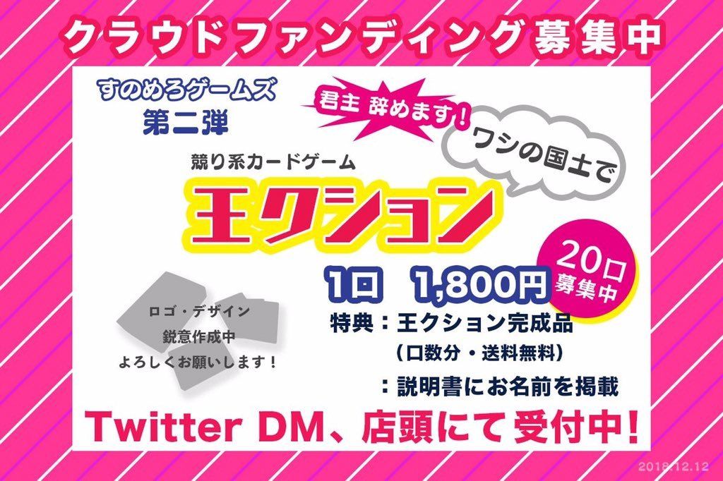 当店オリジナルゲーム第2弾「王クション」、クラウドファンディング募集中です!応募して頂いた方のお名前を説明書に刻みます!本日も1口頂きました!リプライやダイレクトメッセージにてお気軽にご連絡ください!よろしくお願いします!