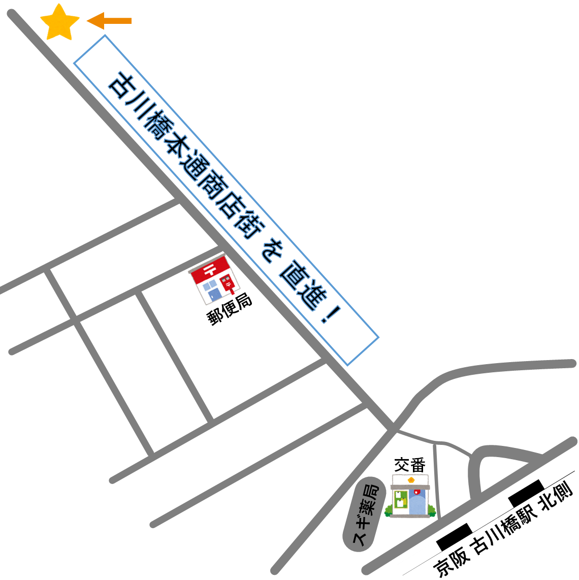 京阪 古川橋駅 より 徒歩5分 (※ 駅からの道案内動画 )