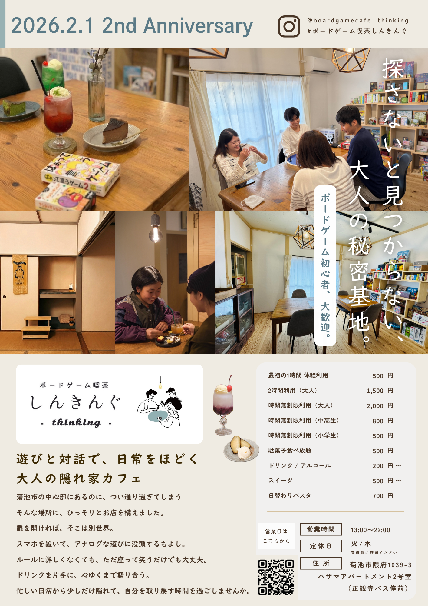 - 19日前2026年01月27日 19時36分頃おかげさまで2周年。感謝の贈り物と、2月のお知らせ。2026年2月1日、ボードゲーム喫茶しんきんぐは2周年を迎えます。少しわかりずらい立地、扉をあけるハードルのあるお店ですが、「アットホームで居心地がいい」「隠れ家みたい〜」といつもご愛顧いただきありがとうございます。3年目も変わらず、日常をほどく「大人の秘密基地」であり続けたいと思います。感謝...21ページビュー