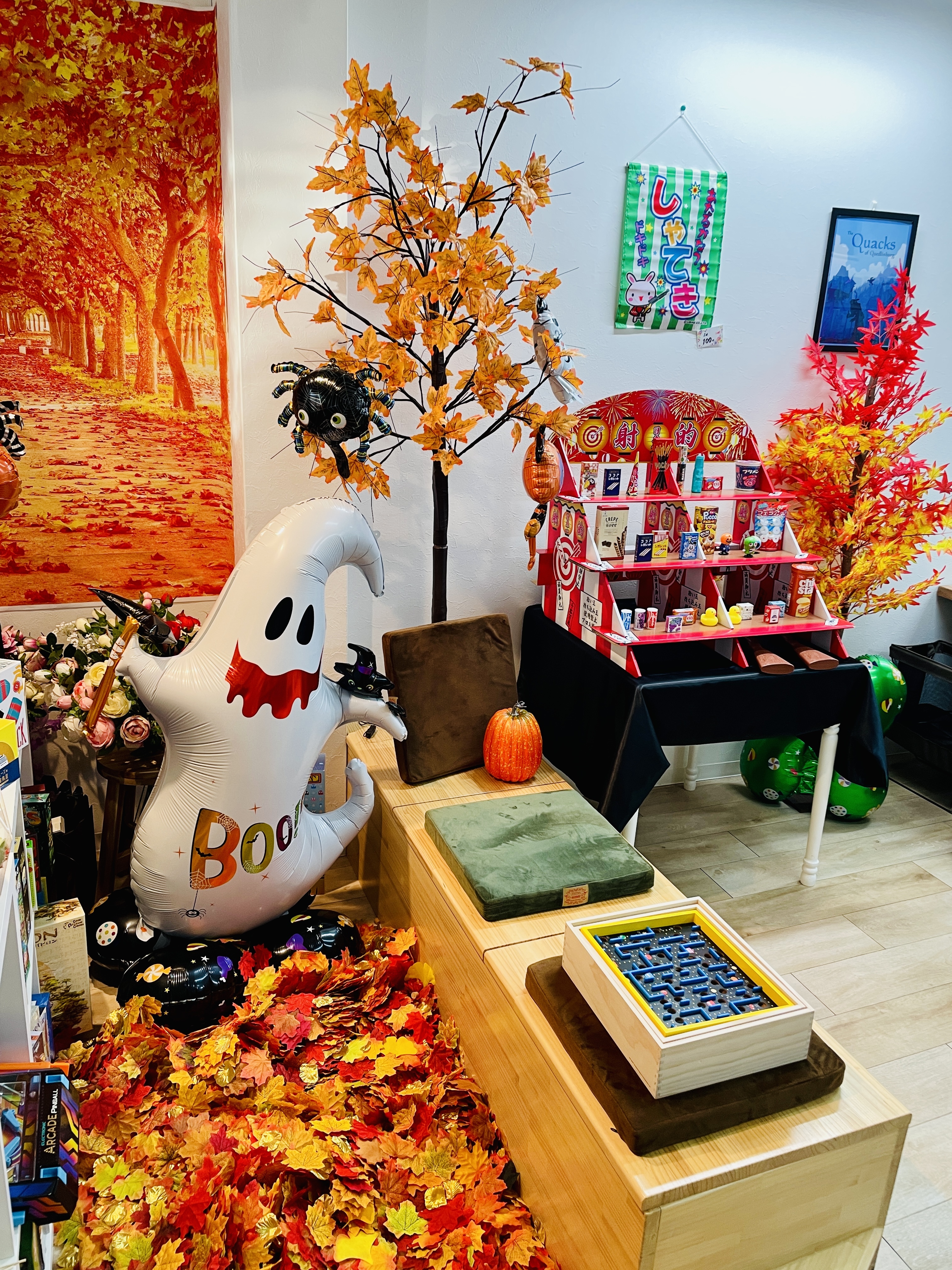 店内には、2周年記念キャンペーンの為、縁日企画の準備に取り組んでいます。また、季節を感じられるコーナーもあり、季節毎に変化があります(写真は秋ver)