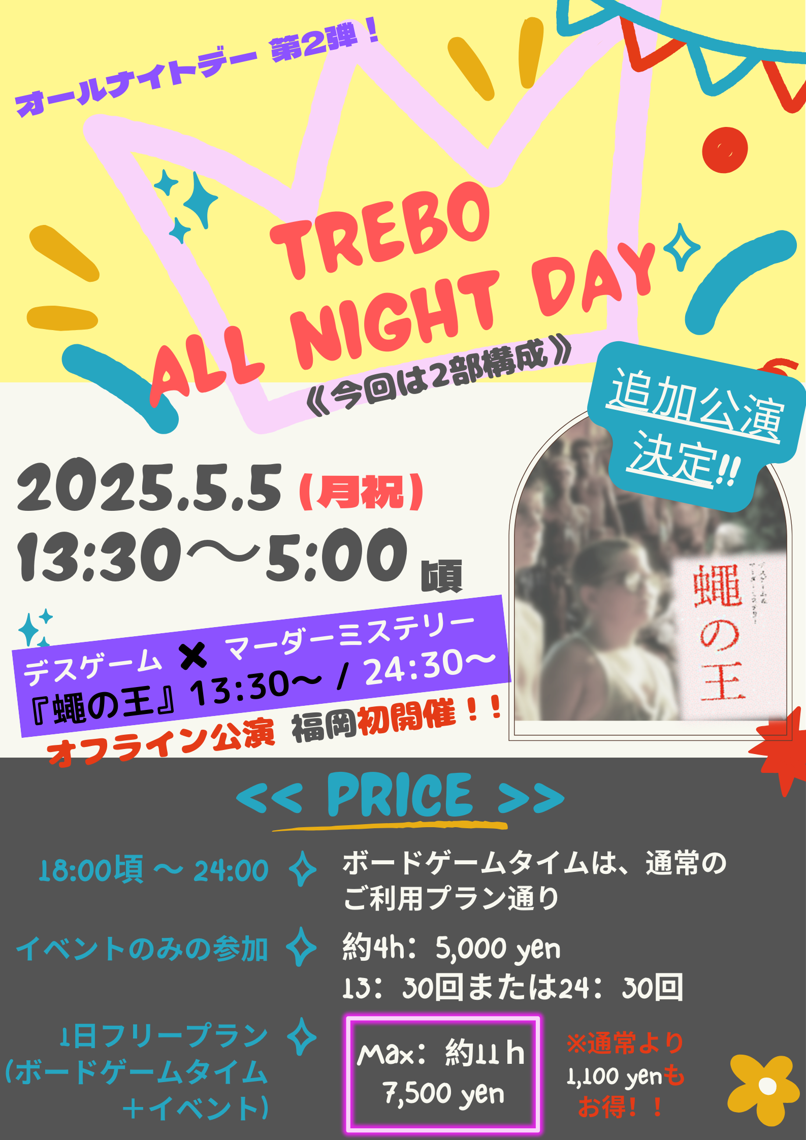 - 8ヶ月前2025年04月21日 04時51分頃大人気企画【トレボ!オールナイトデー】復活♪2024年年末、好評に終わった企画「オールナイトデー」2025年GWで再設定します!今回は、「ボードゲームタイムの第1部」と、オフライン公演では福岡初開催となるデスゲーム×マーダーミステリー「蠅の王公演の第2部」の2部構成で行います!更に、蠅の王公演は「追加公演」が決定!!現在、追加公演含め残...23ページビュー