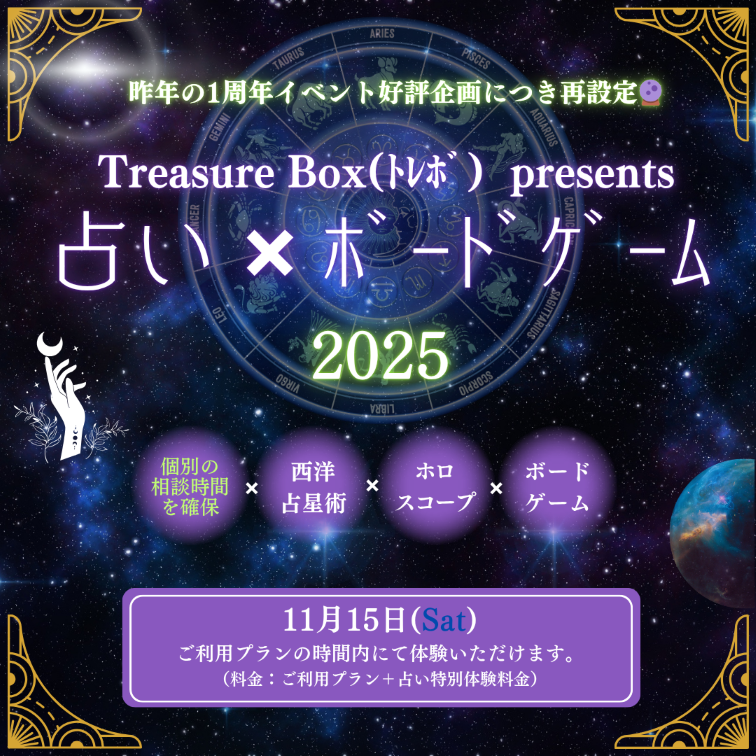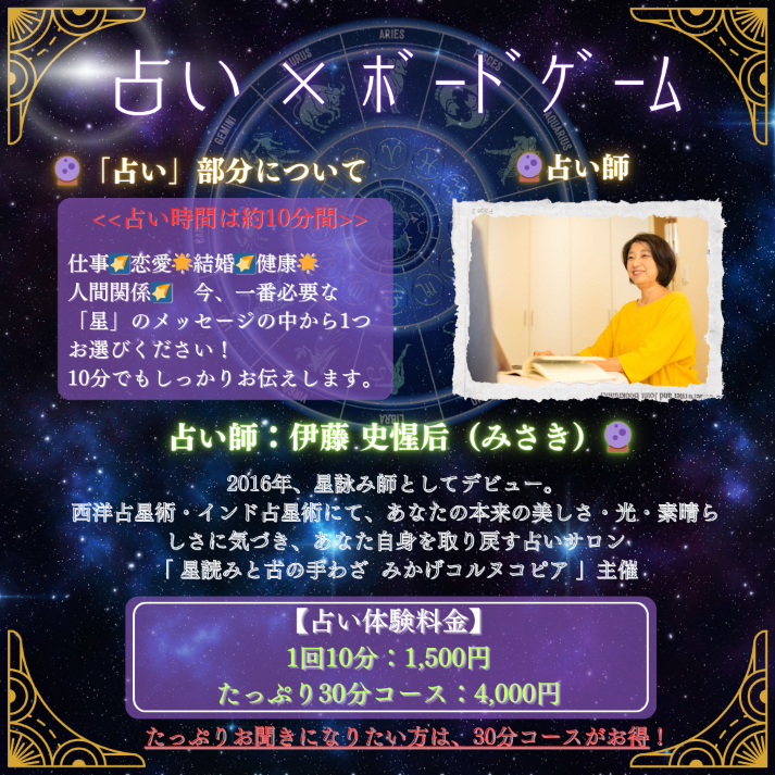 - 24日前2025年11月12日 02時33分頃ボドゲカフェで本格『占い』体験🔮昨年のトレボ1周年を記念して実施した新企画の1つがこの【占い】イベントとなります。今回、1年ぶりに再設定!!ボードゲームカフェで遊んで、ついでに占い師さんから「直接生の声」を伺うことができます。西洋占星術で用いるあなたの「ホロスコープ」をお調べし、あなたの星まわりからあなたが持つ「星の声」をお...20ページビュー