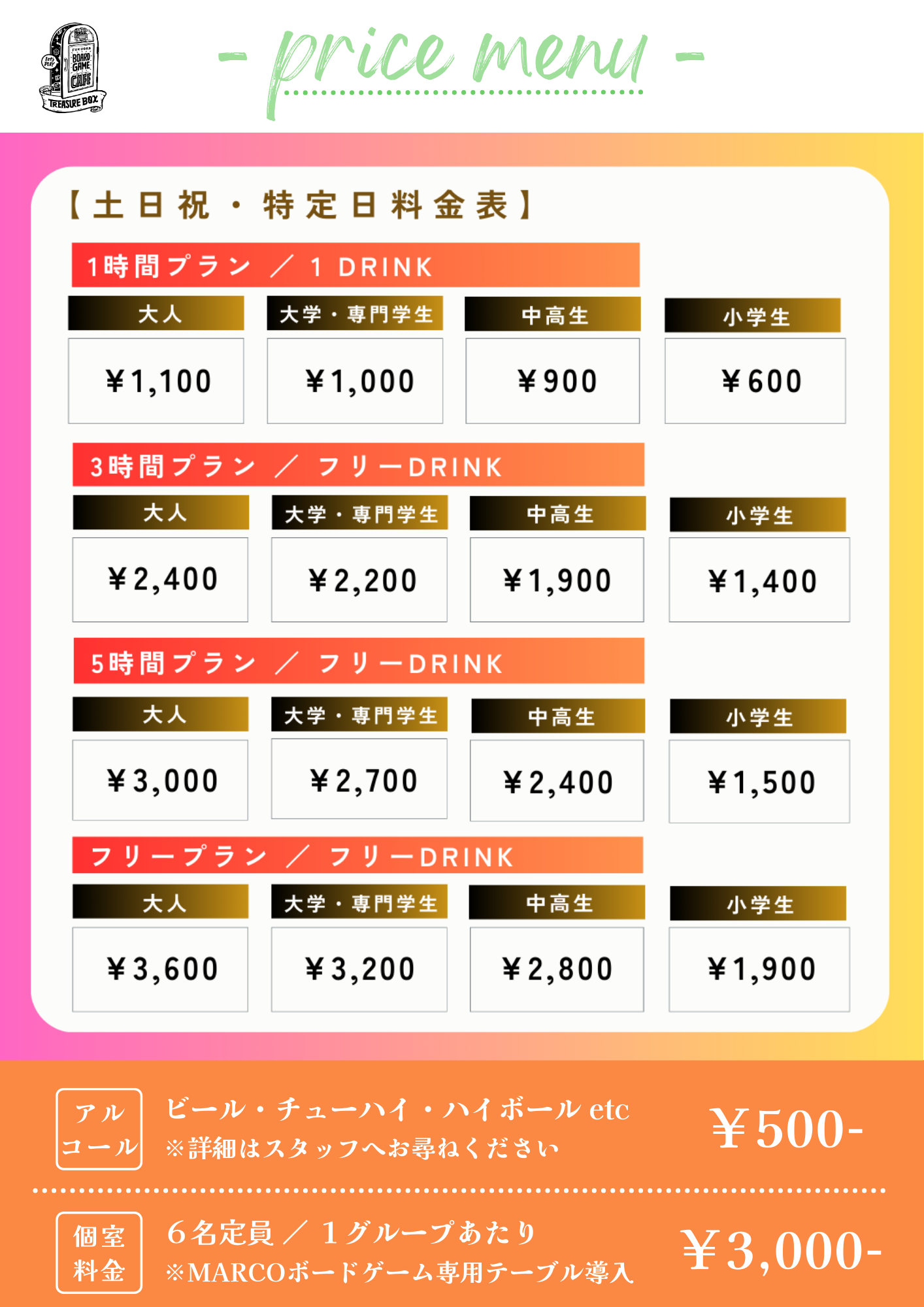 福岡ボードゲームカフェ Treasure Boxでは、2024年12月26日より料金改定・サービス内容の改定及び、新サービスの導入を行うこととなりましたので、お知らせいたします。