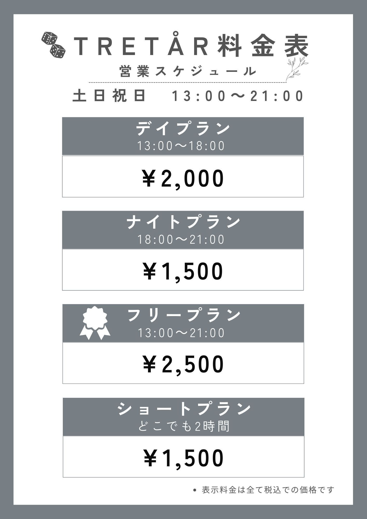 | 料金レンジ | 13:00~18:00で2000円・18:00~21:00で1500円~1日(13:00~21:00)丸ごと遊んでも2500円! |