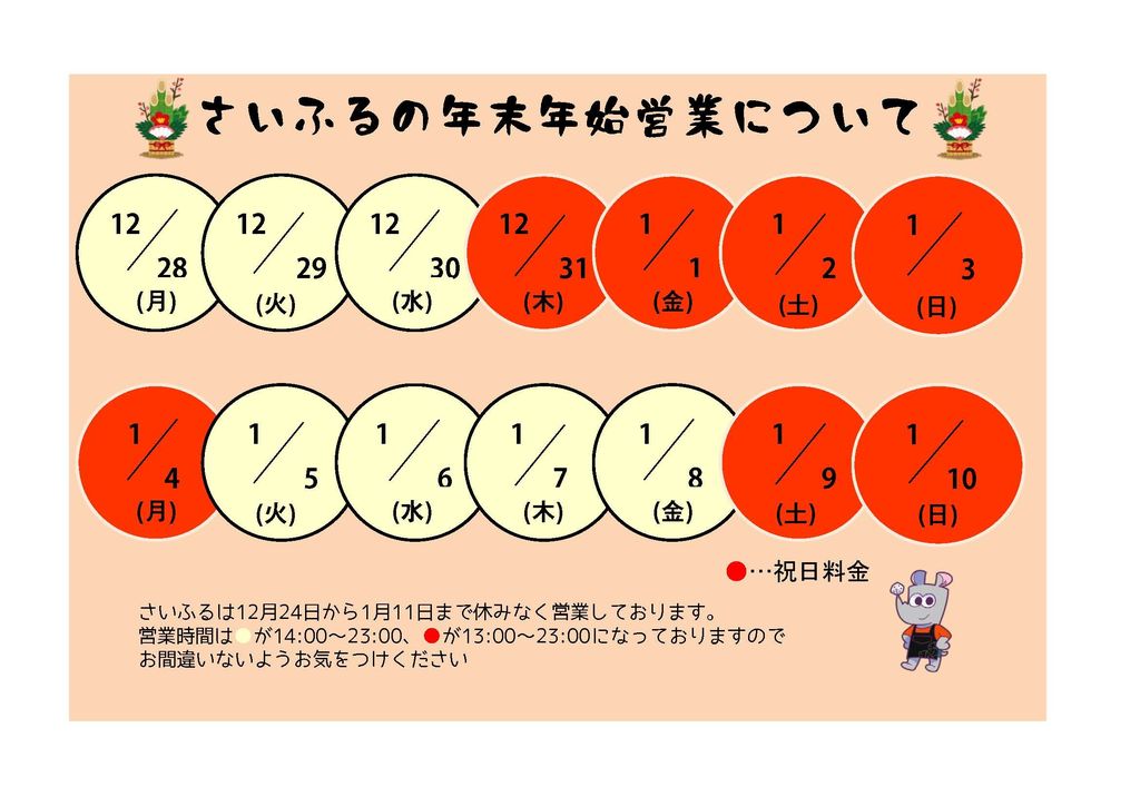 - 3年弱前2022年12月09日 21時32分頃2022年年末・2023年年始の営業時間についていつもさいふるをご愛顧いただきありがとうございます。令和5年の営業は1月1日14時からオープンさせていただきます。以前よりプレイスペースの席数が減っております。確実にお席を確保されたい方は事前のご予約をお勧めいたします。または当日ご連絡にて空席状況をご確認ください。(℡070-4300-675...228ページビュー