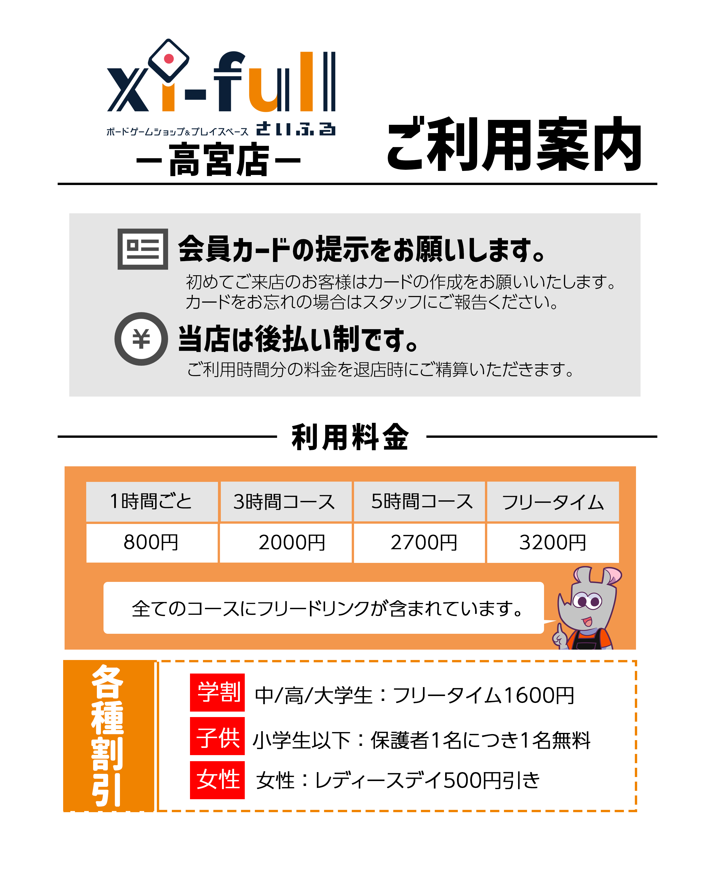 ・ボードゲームご購入金額2,500円ごとにプレイスペース料金の500円割引券を進呈します。