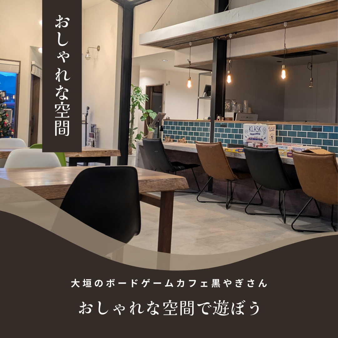 黒やぎさんの店内は、一般的なゲーム会場とは違い、カフェバーとしての洗練された雰囲気が特徴です。木目調の家具や間接照明が落ち着いた空間を演出し、まるでおしゃれな夜カフェにいるような気分でゲームを楽しめます。