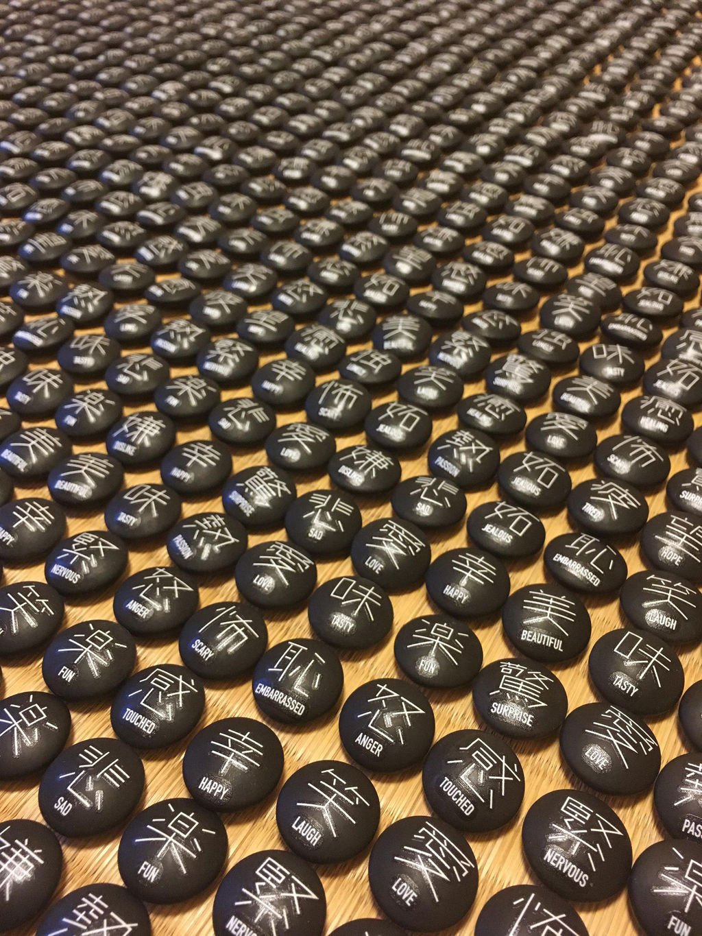 竹素材とてぬぐいでつくられたゲームボードの上に、ガラス製の碁石をならべていくことで、自分の心を描きだしていきます。